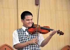 | 文/莊靜如 全盲音樂家 天才鋼琴家呂文貴今年27歲,身軀裡卻裝著一個稚嫩、天真的靈魂。雖然上帝關閉了他的靈魂之窗,卻以音樂為他開啟生命的大門。1984年出生於屏東縣三地門,是位排灣族之原住民孩子,家中有五位兄弟姐妹,文貴是排行老二。父母早婚,18歲時即生下了他,早產的文貴(約6個月便出生)一出生就在保溫箱裡待了兩個多月,也因此造成文貴成為全盲兼重度智障的孩子。 惠明學校校長賴弘毅說,文貴家境清寒,父母時常需出外打零工,無力照顧文貴,便把年幼的文貴交由祖母照顧,但因為居住於偏僻山區,交通不便資源缺乏,當時的文貴又無法用語言與家人溝通,隔代教養下,文貴無法受到良好的照顧,因此整整7年的時間,文貴幾乎是過著與世隔絕的日子。打零工的父母親,又無力負擔文貴的生活開銷及教育費用,因此在一次偶然的機會下經朋友介紹,將文貴帶到台中「惠明學校」正式開始讓他接受學校教育。 教育愛的園地 導師賴清容表示,當時被送到惠明學校的小文貴,大小便都無法自理,因為多重障礙加上未具備生活自理方面的能力,經常跟老師雞同鴨講,大概語言表達只限2-5個字,文貴一切都必須從最基本的技能學起。第一位教導文貴的蔡秀琴老師記憶猶新的說,文貴是個人見人愛的小男孩,黝黑的皮膚,看起來很健康,食量大時常將食物塞得滿嘴再吞下去,小時候的文貴非常可愛活潑。 談起如何發現文貴的音樂天分,蔡老師笑著說,由於「惠明學校」是一所基督教學校,每天早晨都有一段「敬拜時間」,在「敬拜時間」裡有詩歌唱頌。10歲那年,蔡老師在文貴身上發現他對音樂的敏銳度。文貴因為有語言障礙,所以敬拜時間他不太開口唱歌。有一次從禮拜堂回到教室,文貴獨自摸索彈著電子琴,似乎彈出一些曲調,蔡老師仔細一聽,他所彈的旋律竟是在禮拜堂裡教唱的聖歌,當下蔡老師深感驚訝。 往後蔡老師更加注意觀察文貴。蔡老師發現,文貴音感奇佳,有幾次,蔡老師故意播放兒歌給他聽,文貴聽過一兩遍,便能流暢行雲流水地開始彈奏。沒有學過鋼琴的文貴,運用自己的指法,將詩歌的旋律精準地彈奏出來。 蔡老師將這個令人驚喜的發現跟學校反應,校方認為,既然文貴有這方面的才能,就儘量讓他多聽音樂、多彈琴,並商請音樂老師給予他多一些指導。蔡老師說,1996年,一位俄國的特殊教育音樂家計畫在俄國舉辦一個國際性的視障者音樂才能表演。這位俄國的特殊教育音樂家委託東海大學的柯教授,代為尋求台灣具有音樂才能的視障者。當柯教授陪同俄國音樂家來到惠明學校,校方推薦呂文貴給專家鑑定。 當時才13歲的文貴,在音樂表現上已經展現不凡的天賦,許多旋律只要聽過一遍,幾乎就能隨手彈出。經柯教授評鑑,文貴在音樂方面確實是可造之材。校方確定文貴有音樂方面的天賦後,便積極地為文貴規畫學習生涯,幫他尋求專業的鋼琴指導老師,希望他能夠發揮所長。學校幫他找到很有愛心的鋼琴老師教他鋼琴,如此一來,文貴的鋼琴進入了正統的學習。 沒有憂愁的孩子 林文也老師也熱心免費義務指導文貴彈奏小提琴。林老師表示,文貴的音感佳,學習小提琴的方式是先聽整首曲子,對整首的曲子有初步的概念之後,林老師示範曲子的一小節,因為文貴是一位視障者,所以當林老師在示範時,文貴會去觸摸林老師正在拉小提琴的手,以學昔習弓法與指法和把位。文貴的助理老師徐依絮表示,儘管文貴是個多重障礙的孩子,但在音樂的國度裡,他是個充滿自信的樂者。重度智障對文貴而言,與其說是生命的一種缺陷,不如說是上天賜與他的禮物。 陪伴文貴多年的賴老師說,文貴是一位擁有絕對音感的孩子,他擁有比一般人強的記憶,雖然語言發展遲緩影響心智發展,但許多重度智障缺陷的孩子,幾乎都擁有特殊的才能,這也許是上天特別安排賜予的,視障者的聽覺特別好,聽過的曲子便能輕易的演奏出來,聽過幾次後就能將樂譜背下。文貴透過階段式不同的方法,將一首曲子記憶下來。運用手指的律動來結合聽到的合聲,用大腦記下歌曲的樂譜,並靠著腳的上下擺動,抓住歌曲的節奏感。 賴老師表示,文貴由於是一位全盲的孩子,因此必須花比一般人更長的時間,運用靈活的耳朵將聽到的音符,記憶在腦中將背下的譜呈現,必須擁有更過人的意志與毅力才能做得到。可貴的是,文貴殘而不缺認真的態度,將潛藏的音樂天分發揮到極致,也因此改變了他的生活,豐富了他原本寂靜的世界。 徐老師說,在文貴的生命感受裡只有快樂,沒有憂愁。音樂因此而改變了他的生活,豐富他的生命。文貴常用音樂帶給人們快樂及用音樂鼓勵人,並能將所學,用自己的方法教導同班一樣是盲多障的同學學習音樂,所展現的成果真的令全校師生訝異,文貴的音樂才能及展現,可以為人表率,是常人們所不及。 喜樂泰然的人生 賴老師笑著說,文貴是個幸運的孩子,在鋼琴和小提琴的學習都有很好的專業老師指導,他的人生中充滿了無數的貴人。一般的孩子學習樂器,常常是來自父母的規畫與期許,所以不見得是有興趣學習。但文貴不同,他天生是個喜愛音樂的孩子,學習樂器是一種享受,從音符旋律中他得到最大的滿足與快樂。重度智障對文貴而言,與其說是生命的一種缺陷,不如說是上天的給予的一份禮物。文貴是個長不大的孩子,即使他現在已經27歲,他的言行舉止有時仍像個天真的孩子,可愛純真無