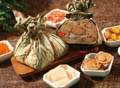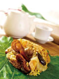 隆重粽品 裹蒸粽是廣東肇慶的特產,以廣式料理著名的老爺大酒店明宮推出道地家鄉味裹蒸粽,主要特色是用大片的荷葉包裹,尖糯米混合綠豆仁,內餡精心挑選墨西哥鮑魚、日本干貝、吊燒烤鴨、牛肝菌、特等豬五花、栗子及冬菇等食材。製作過程中特別注意火候及時間,待粽葉、糯米、綠豆及內餡水乳交融,可呈現香糯醇厚,為裹蒸粽最大的魅力。每粒為3~4 人份,是全家共享的首選。