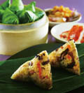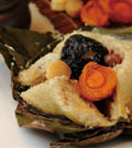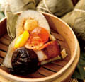裹出滋味 有別於以往的粽子口味,香格里拉台南遠東國際大飯店醉月樓主廚沈春法推出海鮮裹蒸粽將糯米拌炒香後,包入黃金鮑、松葉蟹肉棒以及新鮮日本干貝等食材,再加入櫻花蝦、鹹蛋黃增加香氣與鹹味。考量不同的客層,主廚以杏鮑菇、羊肚菌等鮮美菇類為食材的素食五穀百菇粽,滋味清爽。而八寶蜜香粽以長糯米為主,再以芒果乾、化應子、紅棗、桔餅、冬瓜糖入餡,滿富台灣寶島滋味 。 留戀潮粵 維持傳統好味道,神旺大飯店潮品集今年亦以潮州與粵式風味,推出系列粽品。包括粵式裹蒸大個兒頭,一口氣包進鮑蠔翅參及干貝等多款高檔海味的「極品海味粽」,還包括以陳年老滷入味為號召的「潮州香粽」以及推陳出新以甜鹹風味混搭出創意風味的「椰香欖菜鴛鴦粽」。 簡約環保 因應抗漲及環保旋風,台北喜來登宴會廳主廚史寶財設計「香蟹袖珍粽」,嚴選北海道松葉蟹入餡, 再將拌炒後的香菇、五花肉、乾魷魚等食材加入熟糯米中,運用黑麻油特調的醬汁讓餡料更加入味。 辰園港籍點心主廚梁洪彬推出養生概念的「紫米健康裹蒸粽」,選用紫米、長糯米二比一的比例為主體,再加入柳松菇、牛肚菌菇等養生菇類,以及枸杞、蓮子、山藥等養生素材取代肉類,最後以松子 、百果銀杏與栗子增添香氣及口感,讓裹蒸粽輕盈變身。 人文創意 擅長為傳統廣東料理注入創新活力,台北寒舍艾美酒店中餐行政主廚許文光以鮑魚為主角推出鹹粽「廣式經典鮑魚粽」,米飯部份以圓糯米加入蝦米、五香粉、花雕酒、干貝等食材先行炒香入味, 內餡則以澳洲15 頭鮑與豬五花增添風味與層次, 亦搭配香菇、瑤柱及鹹蛋等食材,為品嚐奢華美味的入門首選。甜粽則為「桂花蔓越莓鹼粽」,融合桂圓與蔓越莓,綴上桂花蜜,展演優雅酸甜的輕快味覺。