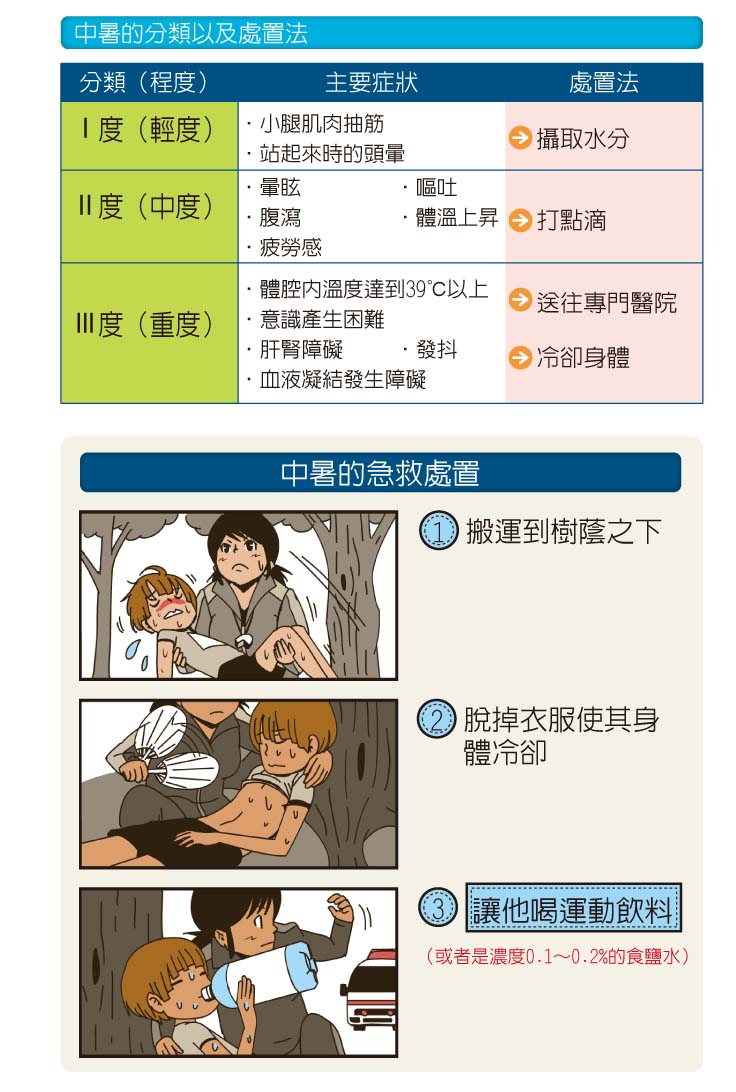 最近中暑的人有愈來愈多的趨勢。中暑一般來說是一種在悶熱的環境裡從事激烈的勞動或運動時,維持體溫的機能受到影響麻痺後所導致的症狀。但是,實際上發生中暑症狀的卻是以高齡者為多,而且還是以在室內昏倒的案例為多。這是由於年紀一大了之後,身體無法順利調節體內高溫的緣故。 一旦發生了脫水狀態,體內的水分和鹽分就會失去平衡、出汗變得困難,體溫也會因此急速上昇,接著產生熱痙攣、暈眩、頭痛、噁心等等的症狀。再更嚴重的話,腦內的體溫調節機能會失常,最後演變成為熱射病。因為過熱所產生的這些症狀可以總稱為中暑。 中暑的時候,喝淡水並不能改善脫水的症狀,這在前面已經說明過了。喝淡水的話,體內的鹽分濃度會因此變得更低,反而會加重細胞內液的脫水情況。在脫水症狀發生的時候,不管再怎麼拚命地喝淡水,脫水率最多最多也只能改善50%。 為了要讓脫水症狀快速的復原,必須要飲用0.1%~0.2%的食鹽水或是鈉離子濃度100ml,40~80mg的運動飲料。現代人對於暑氣的適應能力降低,所以中暑的人變多了。不只是在平常就要注意不要讓脫水症狀發生,其他像是停止運動、冷卻身體的緊急處置,還有關於脫水時水分補給的正確相關知識,都是很重要的。