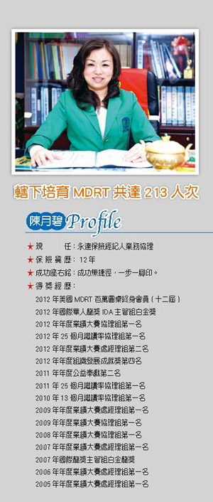 陳月碧 天道酬勤 態度決勝負 文/羅怡如 攝影/楊樹山 想過要賣小吃、開餐廳,也想過要從事電子產業,或許是天生服務的使命使然,永達保經協理陳月碧抱持著助人的理念,加入了保險業。「我比別人晚進這一行,就要花更多的時間累積上去!」就是這樣積極主動的態度,讓她不斷累積成功,坐對位置,成就大事!  黃金業務變身高階主管 由團隊標語「以平台吸引人才,以人才服務平台」,可見月碧體系對人才的重視,現在的月碧體系有一百人,人才濟濟,與陳月碧初次發展組織時的情況有天壤之別。當初,她以本科系專業背景之姿投入保險業,在個人行銷方面表現相當出色,曾榮獲「安泰人壽全國銷售業績個人組第十一名」,卻在發展組織時,始終不得其門而入,直到加入「永達保經」才有了改變。永達保經主打退休理財,市場定位明確,有豐厚的後勤資源協助,提供廣大的舞台讓業務員得以全力發揮,在這裡,陳月碧有更多的時間輔導組員,全力發展組織。過去在其他保險公司,她第一年從事行銷,以一百ㄧ十一件完成MDRT,第二年發展組織,僅帶領一位夥伴;進入永達保經後,第二年便增員十二人,以二十件案子完成MDRT。 陳月碧認為,自己不是「頂尖業務員」,她用自己獨創行銷方式達到「不銷而銷」。「我會先和對方交朋友,依據他的需求提供附加價值,我認為,人大於商品,大於公司,唯有讓客戶認同我的個人品牌才有機會!」,她以同樣的道理延伸,告訴夥伴們:「把量放大,找出銷售循環!」 適才適用 育才完善 本身是MDRT 終身會員的陳月碧,在個人行銷上創下亮眼佳績,帶領組織更是有一套。她相信「人才值得等待」,只要是菁英,她甚至三顧茅廬去禮聘。秉持「用『薪』留才、用『新』留才、用『心』留才」的理念,陳月碧用心經營每一個夥伴。她常以「挖鑽石」的故事勉勵部屬:「行銷猶如挖鑽石,過程中,一定會挖出許多土堆石礫,這些就好比是挫折, 一旦穿越了, 就成功了!」陳月碧用心培養高階主管及講師,每一位平均花1 ∼ 2 年的時間培訓,安排每個月到大場合講課一次。除了耐心指導,陳月碧的管理哲學是「充分授權與分工」。用人唯才加上密集的培訓,締造月碧體系創下自永達保經開創以來,拿下六個冠軍獎項的榮耀! 紮實腳步 積極拓展  縱使陳月碧在永達保經2012 年年度業績大賽中榮獲協理組第一名、25 個月繼續率協理組第一名、華人龍獎主管組白金獎等榮耀,她還是為自己的表現打了七十分,認為有很多需要學習、調整的空間。今年開始,月碧體系將定調在「提升」,提升P 值、競爭力、位階思考,尤其是思考領域,陳月碧表示,今年教育訓練目標放在「訓練思考」,期望夥伴們都能清楚自己的定位,精進學習。而「開發」是業務員80%的生命,陳月碧將持續教導夥伴如何開發、竭力為客戶服務,並發展組織。延續今年交出漂亮成績,未來,月碧體系將定位在四大方向:一、指導初期同仁運用類長照商品開發市場求生存。二、進而協助其轉型銷售「退休理財」,為普羅大眾服務。三、進入「財富管理階段」,信託、資產保全、海外所得等。四、跨國發展,前進大陸市場。陳月碧衷心地期盼,每一位夥伴們都能逐步進階,完成自己的夢想!