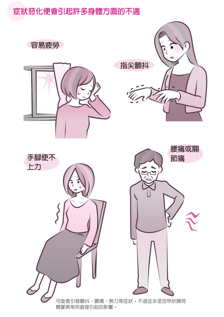 大多數的患者都會抱怨「很容易覺得疲勞」。荷爾蒙過多會使心臟過度運作,這就是使身體會一直處於如同小跑步狀態的原因。很多巴塞杜氏病患者特別會在早上,身體就會開始感到疲倦了。 此外,也有患者指出他們出現肌力衰弱的自覺症狀。例如拿不動重物、上下樓梯覺得很辛苦等等。也有很多病例會出現腰痛、關節痛等跟肌力有關的症狀。 有七成巴塞杜氏病患者會出現指尖顫抖的現象,這並非像帕金森氏症那樣會引發相當嚴重的發抖症狀,而只是指尖會有些許的顫抖。此外,也有些患者的眼皮或上臂也會出現顫抖的症狀。 女性患者會有月經變少、月經不順的情形。男性患者則會出現乳腺增大而有類似男性女乳症的現象。此外,性慾減退也是被證實的症狀之一。